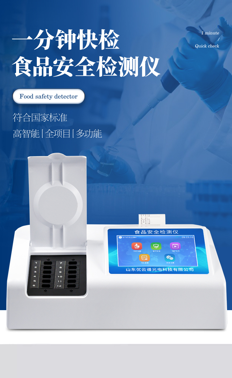 可快速檢測各類食品中的亞硝酸鹽、二氧化硫、甲醛、吊白塊、雙氧水、硼砂、農藥殘留、乳及乳制品中蛋白質、硝酸鹽、重金屬鉛的含量,儀器預留其他項目檢測程序和端口,根據日后需求可方便的自主增加檢測項目。