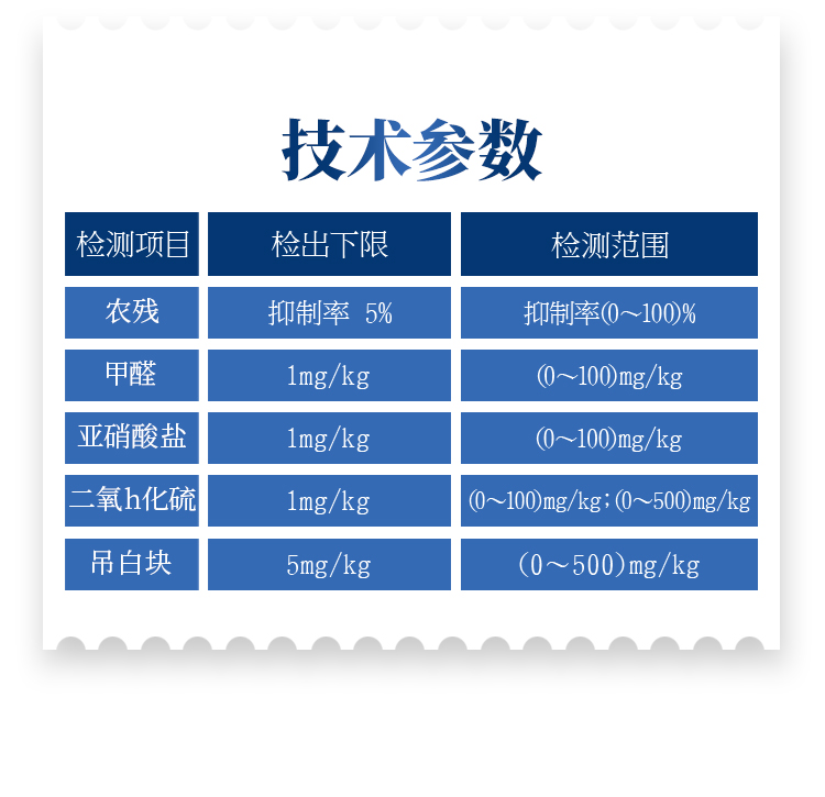 1、農殘:檢出下限:抑制率5%,檢測范圍:抑制率(0~100)%