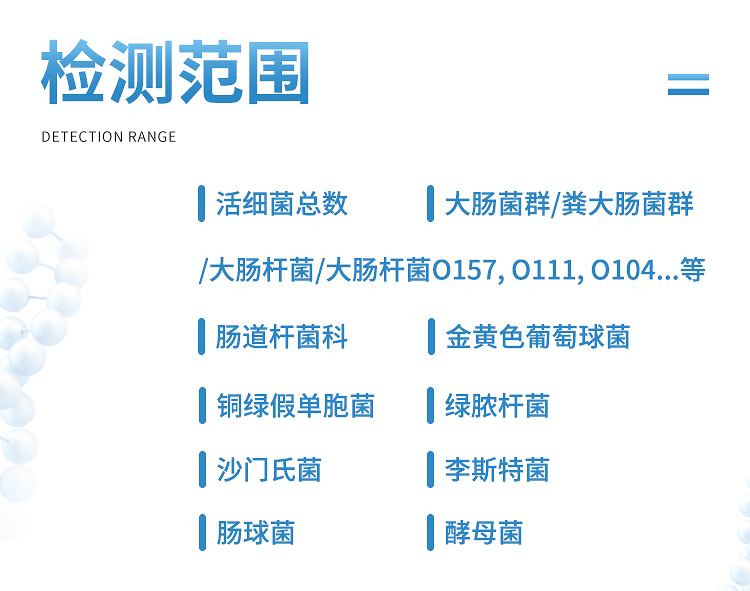 4.檢測項目:菌落總數、大腸菌群、腸球菌、大腸埃希氏菌、腸道桿菌科、綠膿桿菌、李斯特菌、金黃色葡萄球菌、沙門氏菌、酵母菌等微生物。